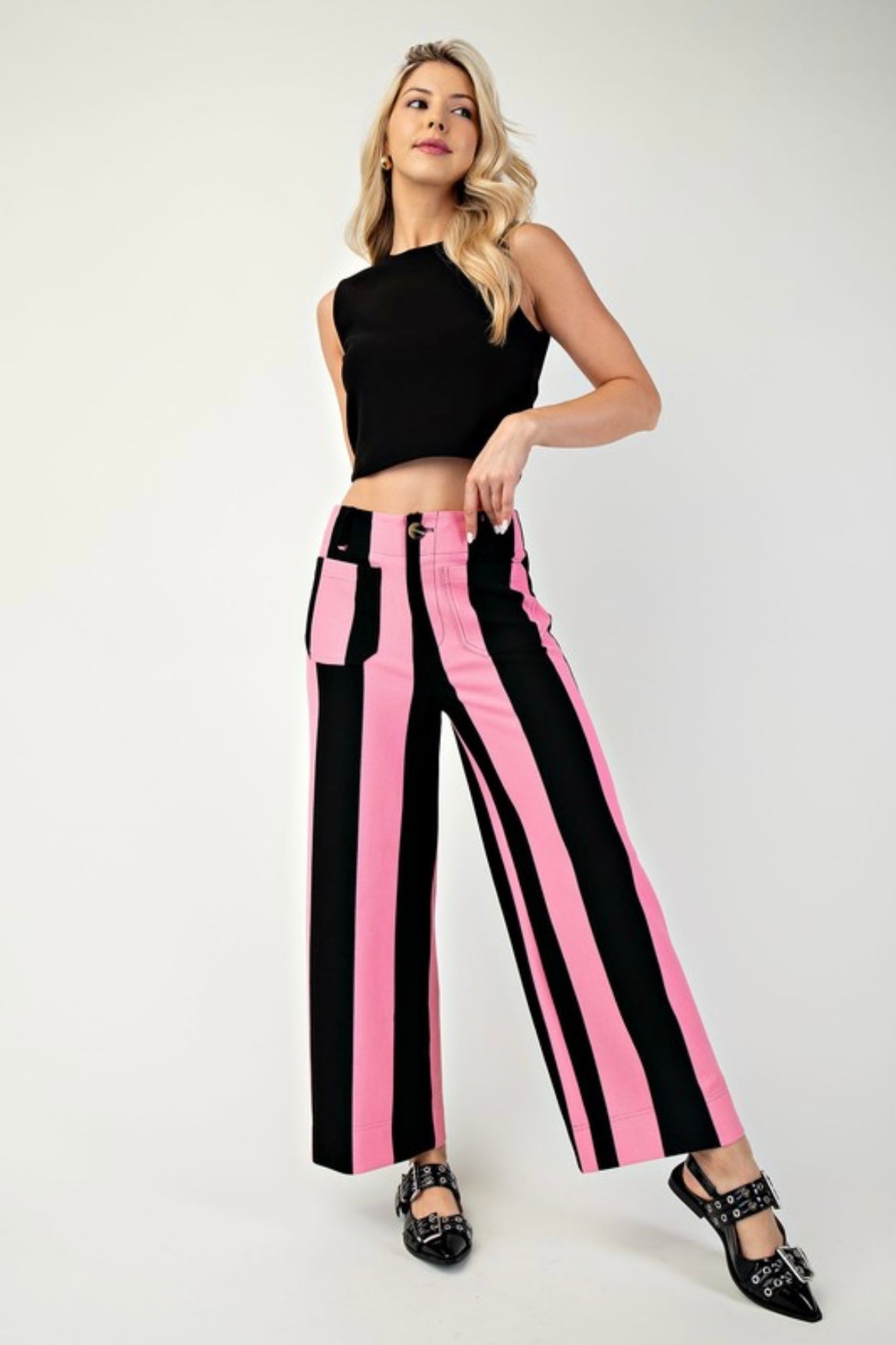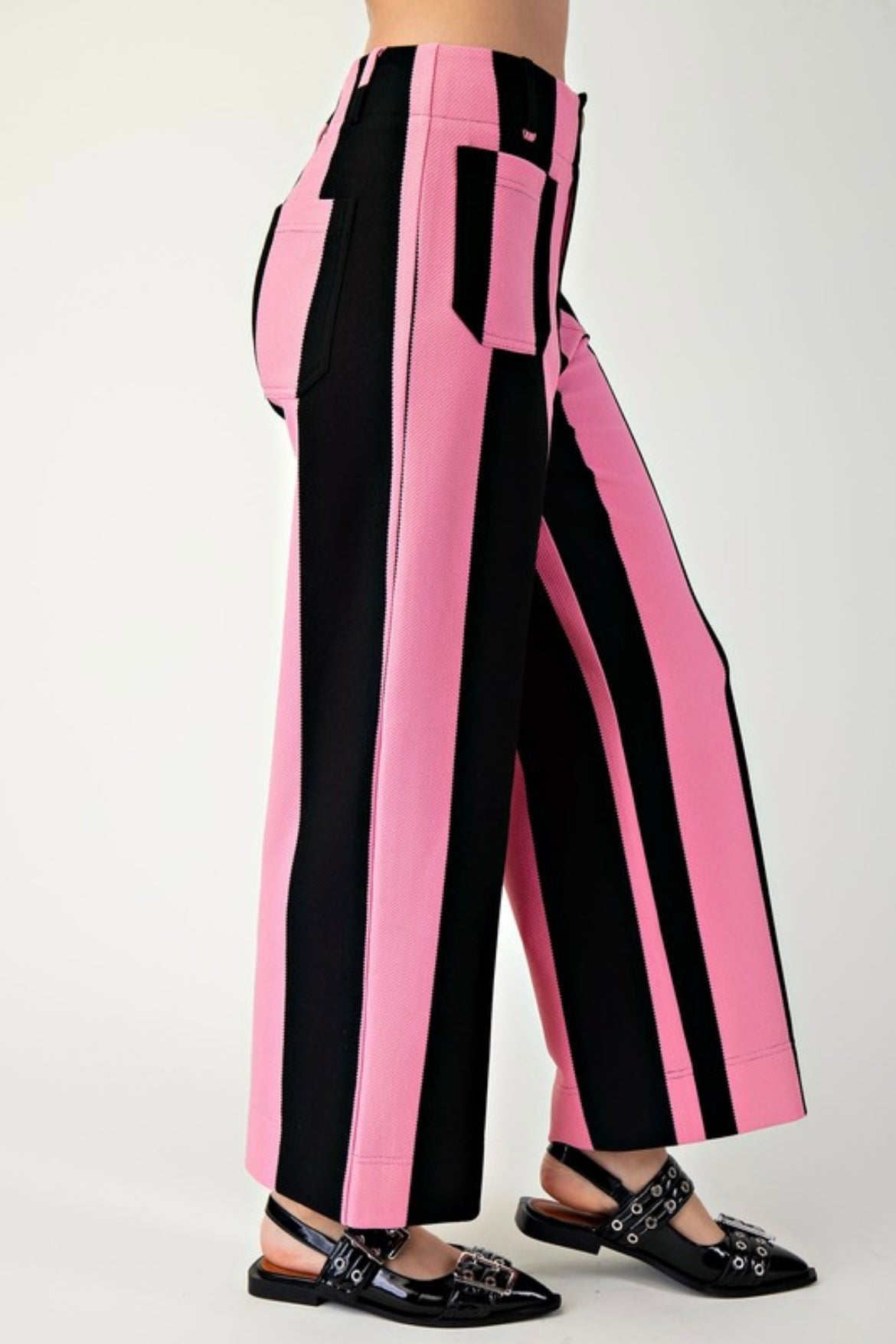 Elevate your wardrobe with our JELLY PANTS! Featuring a stunning straight-leg culotte design, these pants are a perfect balance of style and comfort. The pink and black stripes add a playful touch to any outfit. Get ready to turn heads with these beautifully fitted pants!